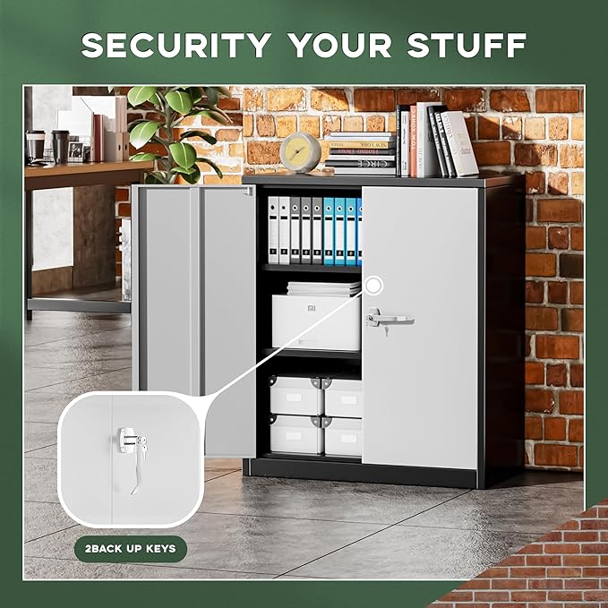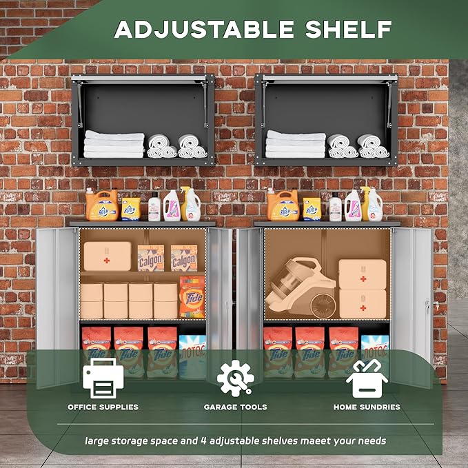 - [Locking Design]:The steel garage storage cabinet with the silver handle and lock block on the side cabinet door, the overall create a modern style.Meanwhile, we provide 2 keys, the lock block is designed to effectively protect your various valuable documents and belongings.