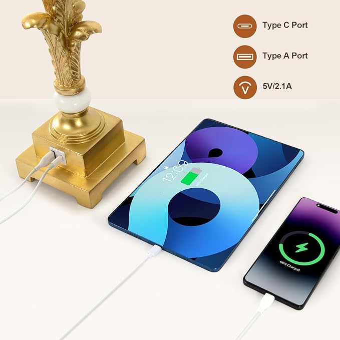 - USB A+C Charging Ports: Gold buffet lamps have convenient dual USB charging ports, allowing you to charge two electronic devices simultaneously. Whether the lamp is on or off, you can easily charge your phone, tablet, Kindle, or other devices