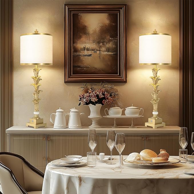 - Unique Designs: White linen fabric with gold trim shade soften the light and add a luxurious feel. The lamp body is adorned with a gold leaf finish, complemented by a white marble ball as a decorative. Gold lamp can be used for both lighting and decor