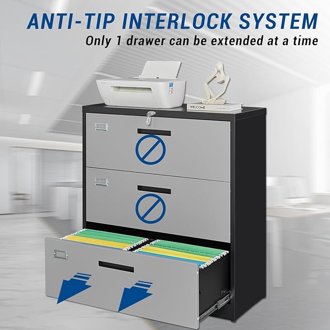 - ANTI-TILT DESIGN- When you fully open one drawer of this file cabinet, the other drawer cannot be opened. This is to prevent the drawer from storing too much paper and causing the cabinet to topple over.