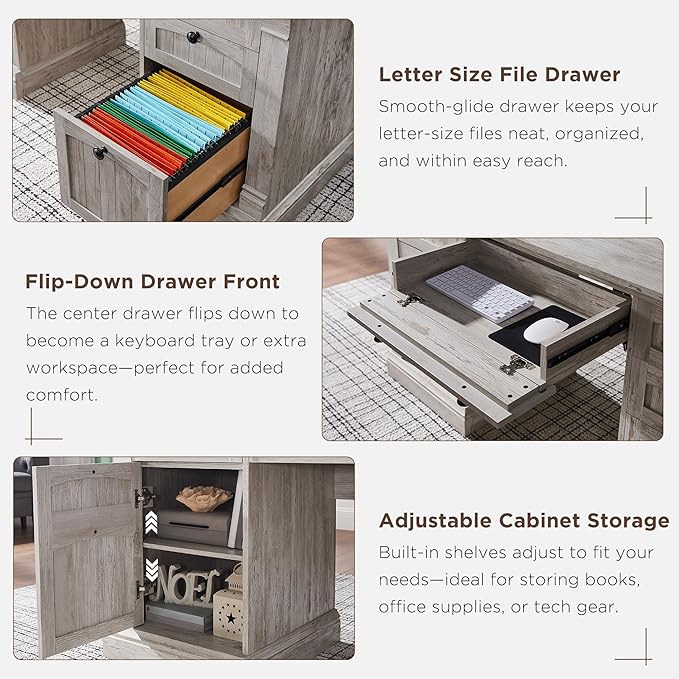 - Ample Storage for a Tidy Workspace: Keep your office organized with a large file drawer for letter-size documents, three utility drawers for supplies, and a cabinet with an adjustable shelf. A dedicated compartment also fits a vertical CPU tower—so everything has its place and stays out of sight.