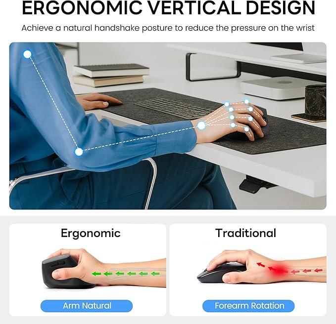 - Ergonomic Design for Comfort: The vertical mouse provides an ergonomic mouse solution with a comfortable grip, reducing wrist strain and promoting better posture for long-term use. Ideal for ergonomic mouse wireless needs. Mouse Dimensions: L x W x H 11.6 x 7.2 x 7.5 cm /4.57 x 3.03 x 2.95 inches.