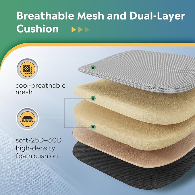 - Breathable Mesh and Dual-Layer Cushion for Extended Comfort: The back and seat feature breathable mesh, providing excellent airflow to prevent heat buildup from prolonged sitting. The dual-layer high-density foam cushion (25D + 30D) combines softness with robust support, effectively reducing hip pressure and offering lasting comfort—perfect for both work and gaming sessions.