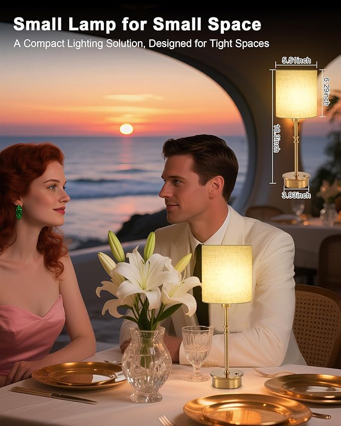 - Perfect Size For Ambient Lighting- This small lamp is designed with the perfect size (Height: 16.3in, Diameter: 5.51in) for ambient lighting. It’s 2700K warm and inviting glow light enhances the atmosphere of any room, be it your kitchen countertop, entry table, or nightstand. (1Gold Lamp Base, 1 Fabric Lampshade, 1 Light Bulb, 1 Adapter, 1 Type-C Cable Included)
