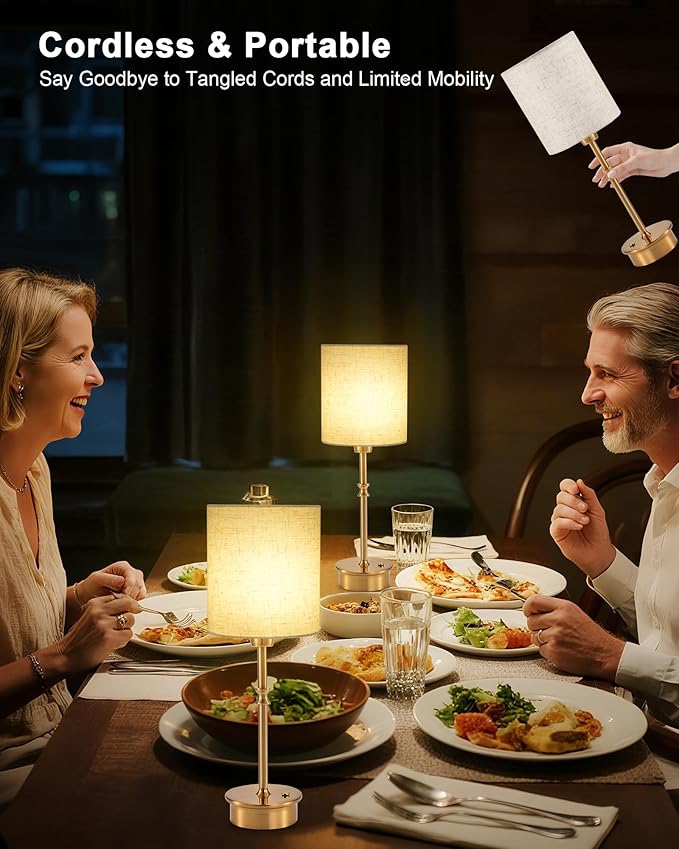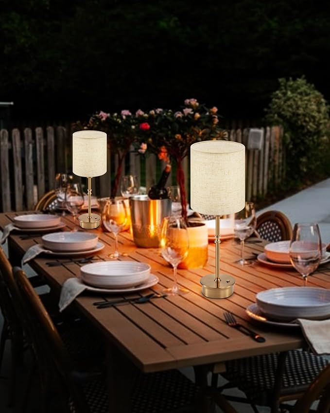 - Design & Aesthetics- Our unique gold brass base & linen shade lamp with a classic design that exudes luxury and seamlessly blends with various decors. Its elegant appearance makes the rechargeable lamp a perfect for kitchens, bathrooms, nightstand, outdoor hurricane and living room entry tables as an elegant accent lamp. Elevate the ambiance with pleasing ambient lighting solution