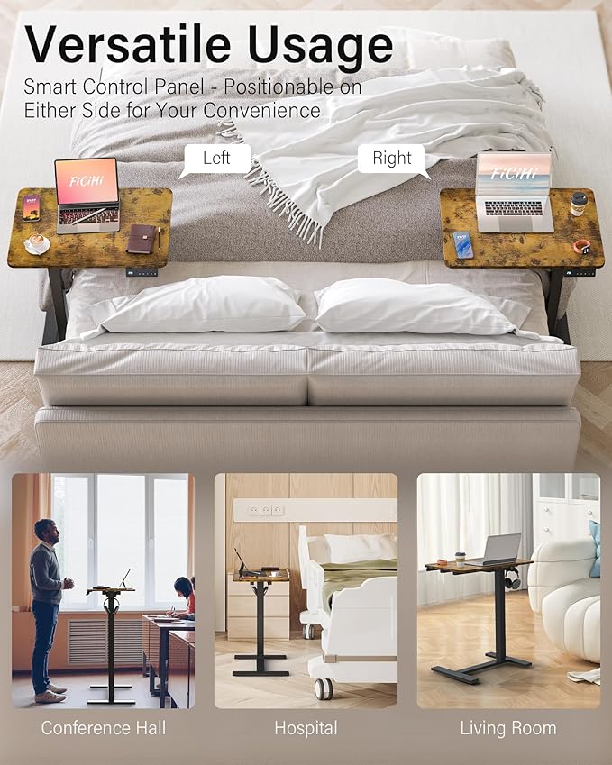 - 【Quiet & Electric Adjustable Height】FiCiHi Electric Overbed Bedside Table features a hidden brushless motor for whisper-quiet operation (<43dB). Adjust the height from 28" to 46.9" with 3 memory presets for a seamless work or relaxation experience.
