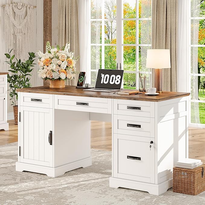 Whalefall 55'' Farmhouse Desk Home Office with Drawers, Executive Computer Desk Wooden with File Cabinet and Charging Station, White