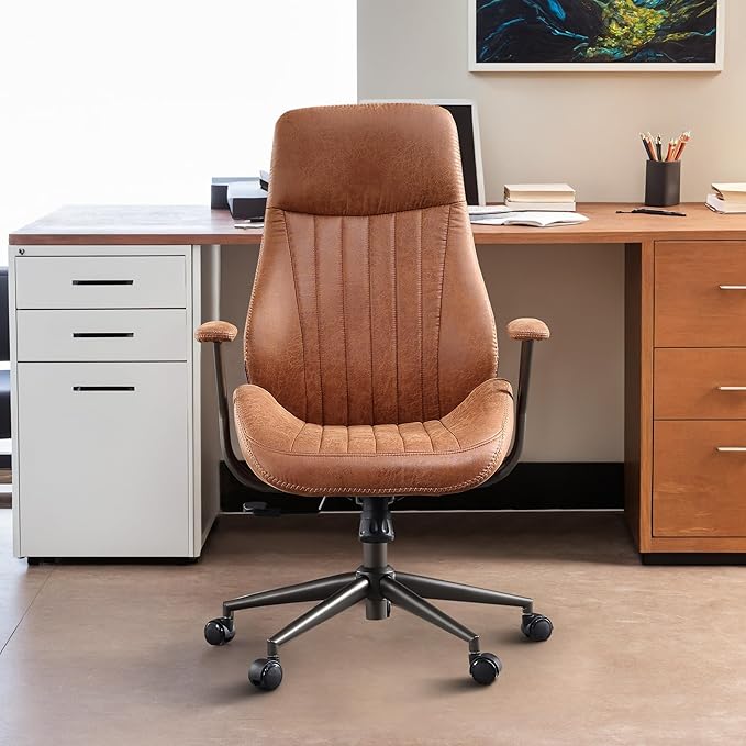 Mid Century Modren Office Chair - Fuax Leather Suede Brown Executive Chairs Ergonomic Mid Back with Lumbar Support, Swivel Computer Desk Task Chair with Wheels for Home Office (Brown, Hign Back)