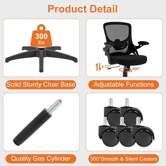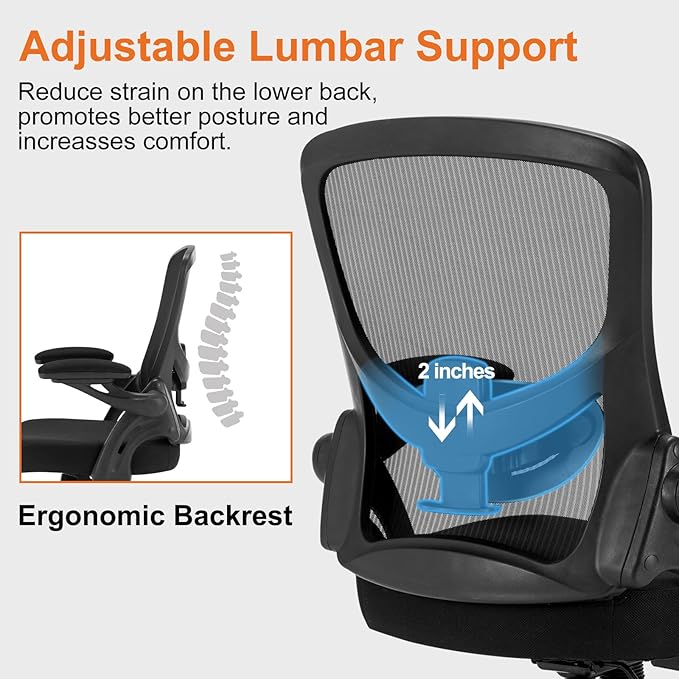 Office Chair, Ergonomic Computer Desk Chair with Adjustable Lumbar Support Comfy Breathable Mesh Chair with Flip-up Arms, Mid Back Swivel Executive Task Chair for Home Office 300lbs, Black