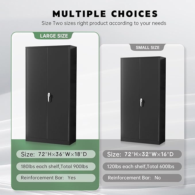 - 【Large storage space】Greenvelly metal storage cabinet with adjustable layers shelves 2 doors is paired with a large size design of 71 X 32 X 16 inch, and each layer can bear 180 pounds. Lockable black metal cabinet is very suitable for storing office documents and heavy household items and other daily necessities. The metal garage storage cabinet with lock is an ideal choice for business, home office, garage, school, kitchen, warehouse, and more.