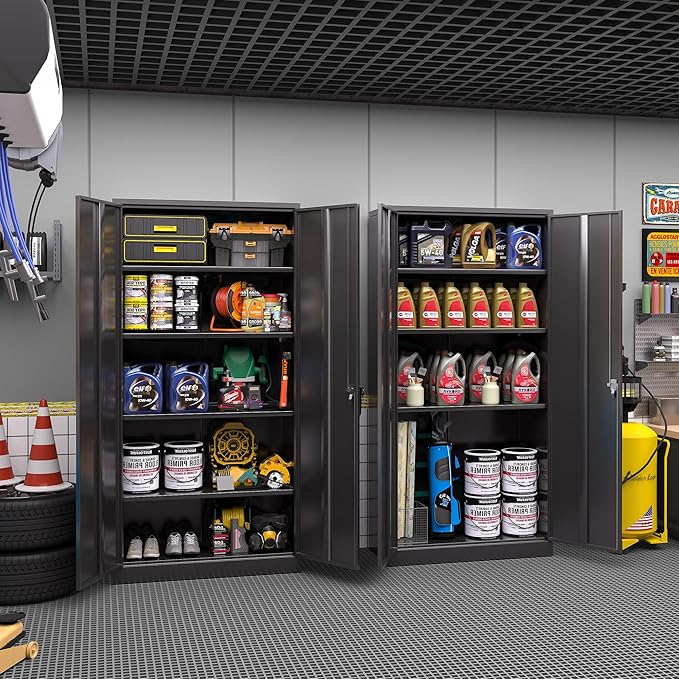 Greenvelly Metal Storage Cabinet with Lock,71" Metal Garage Cabinet with 2 Doors and 4 Adjustable Shelves,Lockable Storage Organization, Steel Tool Cabinets for Office,Home,Garage,Gym,School (Black)