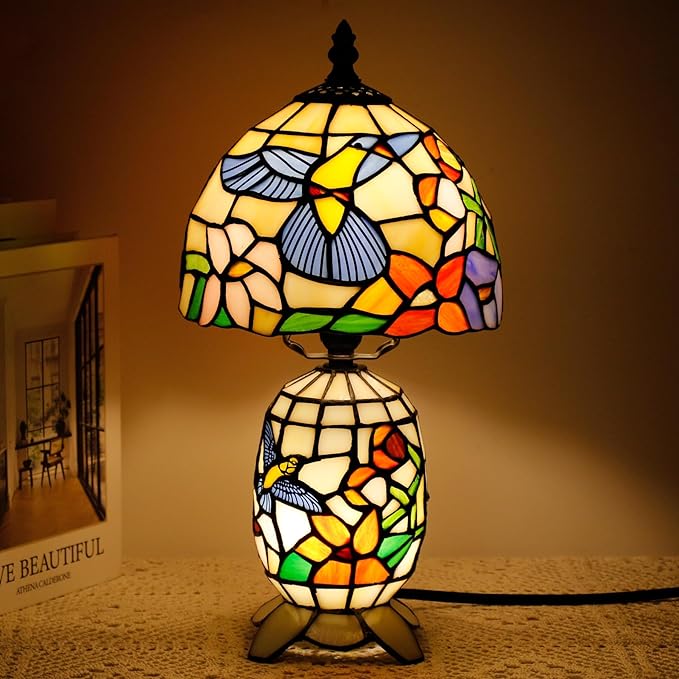 Small Tiffany Lamp Stained Glass Table Lamp Mini Mother Daughter Vase Desk Accent Light for Bedroom Bedside Reading Home Antique Style Decor 8X14 Inches (Hummingbird)