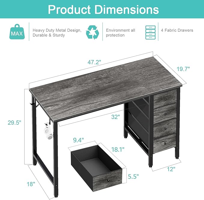 Lufeiya 47 inch Computer Desk with 4 Fabric Drawers, Writing Work Study Desk for Home Office Bedroom, Modern Simple Student PC Desks, Gray