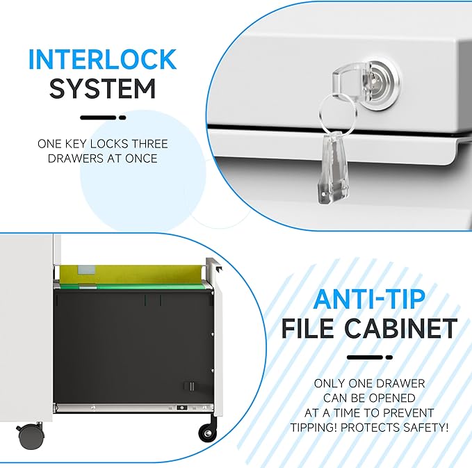 - đăANTI-TIPPING THOUGHTFUL DESIGNăOur locking filing cabinets are equipped with 5 sturdy casters to make it easy to move the cabinets to different positions. 2Ă360° easy swivel casters + 2Ălockable casters + 1Ăanti-tipping caster. Always ensure stability and prevent the file cabinet from tipping over accidentally.