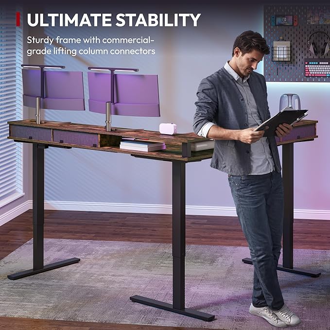 SANODESK 63" L Shaped Standing Desk with 4 Drawers, Height Adjustable Stand up Desk, Corner Gaming Desk with Monitor Stand, Black Frame/Rustic Brown Top