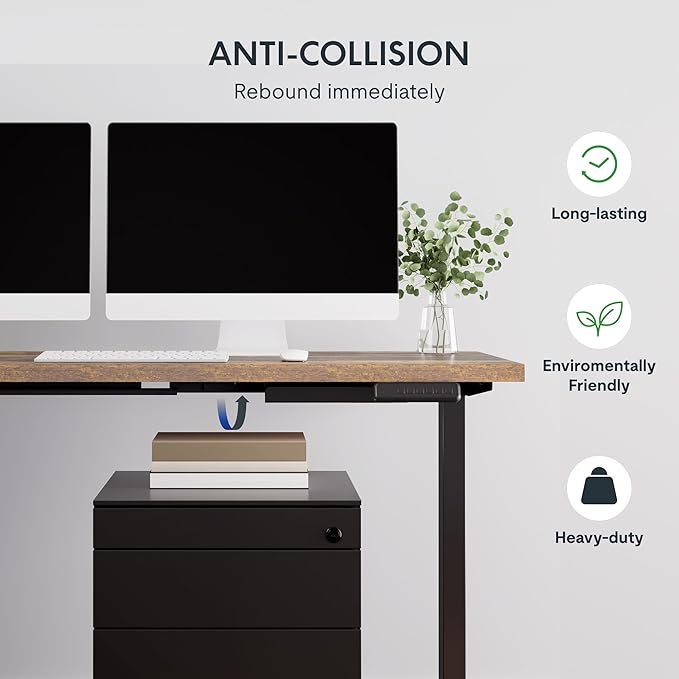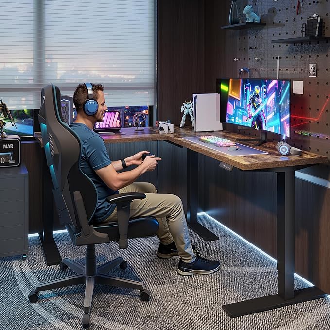 - 1. Sturdy L-Shaped Design with Three-Leg Stability Crafted with a heavy-duty steel frame and durable laminate desktop, this L-shaped desk offers superior stability in any corner setup. The innovative three-leg design maximizes floor space while providing robust support, ensuring wobble-free performance even at full height. Ideal for dual-monitor setups or multitasking.