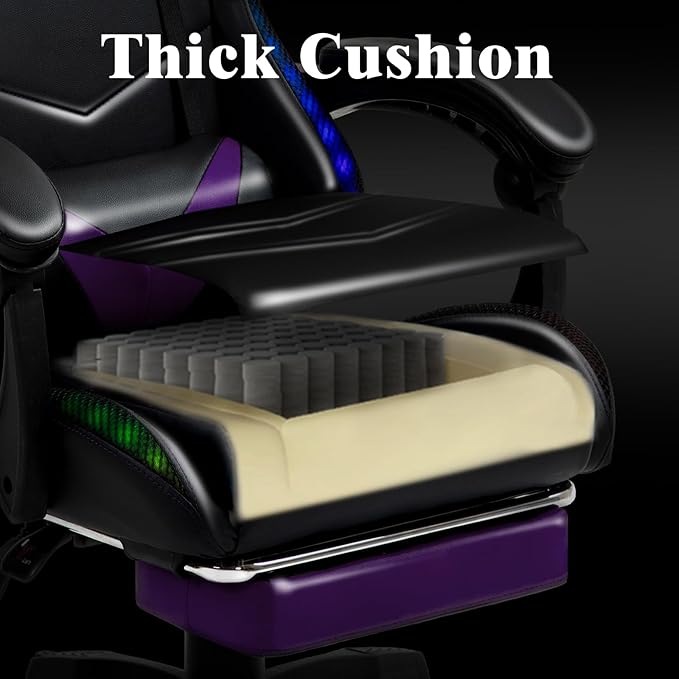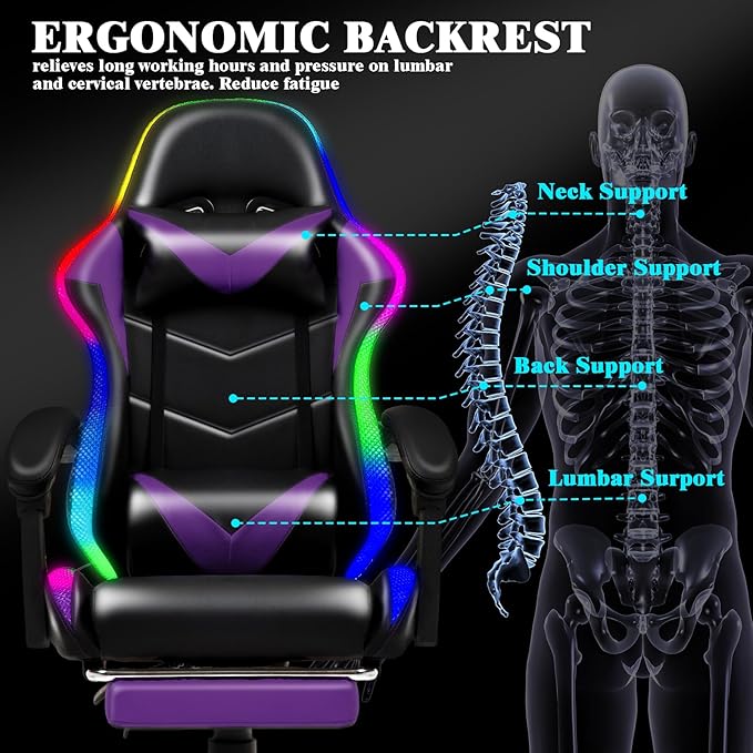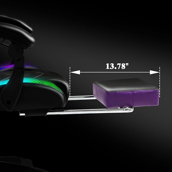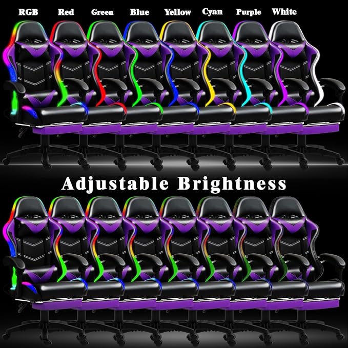 RGB LED Lights Gaming Chair with Footrest for Adults and Kids, Lumbar Support Massager Video Game Chair, High Back Reclining Gamer Chair with Headrest, Swivel Office Computer Desk Chair(Purple)