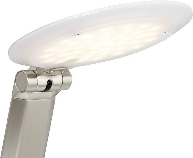 - Satin nickel finish silver color base, arm, and lamp head. Metal construction.