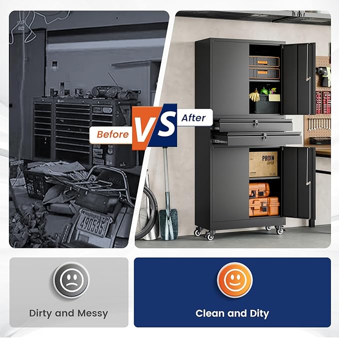 - 『PRACTICAL DESIGN』:Our tall metal cabinet equipped with 2 drawer and 2 adjustable shelves to provide adaptability and convenience. Wheels(2 lockable wheels) with 360° rotation can easily move to anywhere & stay in a fixed position. High-grade lock picking to secure valuables.cabinet has three locks each with two keys,regardless of what your storage needs are, you have the ability to create a unique storage space to suit them.