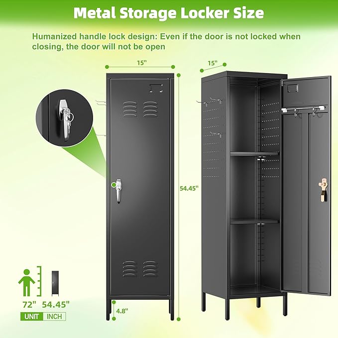 - 【Large Storage Capacity】1 doors metal lockers for employees with Lock 15"D x 15"W x 54"H. Equipped with 5 hooks and 2 Pegboard,it can meet your needs for storing different sized items and meet most of your daily needs.