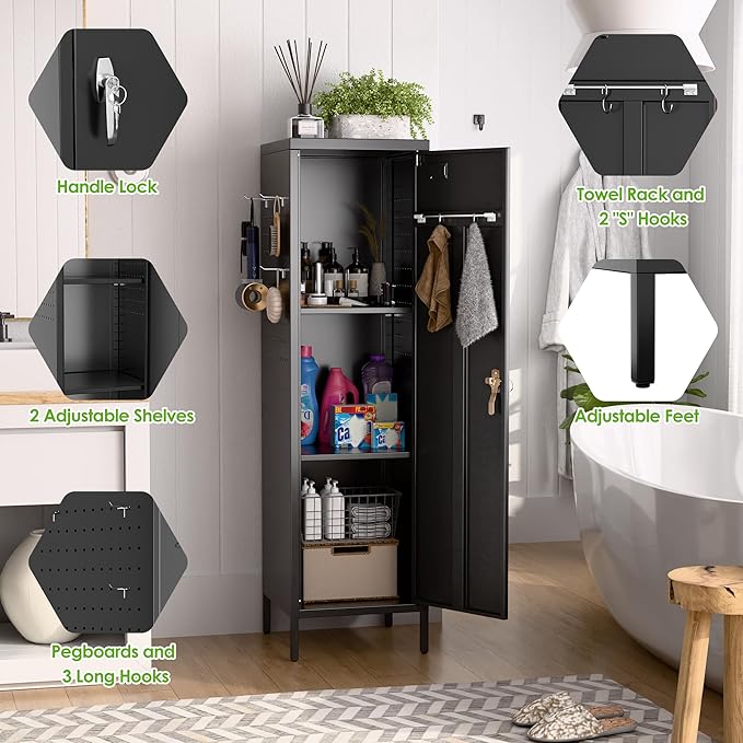 Metal Lockers for Employees with Handle,Metal Storage Locker with 2 Pegboard & 5 Hooks for Gym, School, Office,Home,Garage,Black