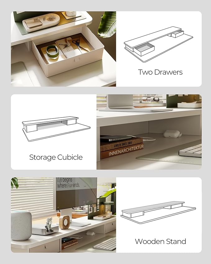 - Spacious Work Space: The top shelves with double drawer design expertly make your desktop tidier and helps you head up when you put your screen on it