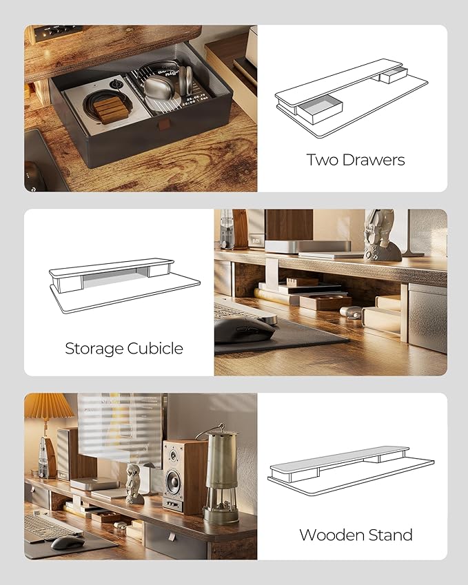 - Spacious Work Space: The top shelves with double drawer design expertly make your desktop tidier and helps you head up when you put your screen on it