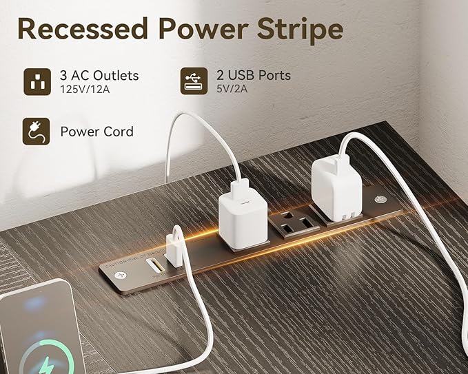 - 【Built-in Power Outlet】 Stay connected with 3 AC outlets and 2 USB ports, eliminating the need for extra power strips. Charge your laptop, phone, gaming device or desk lamp effortlessly. Also, this design eliminates cable clutter, creating a cleaner workspace for professionals and gamers alike.