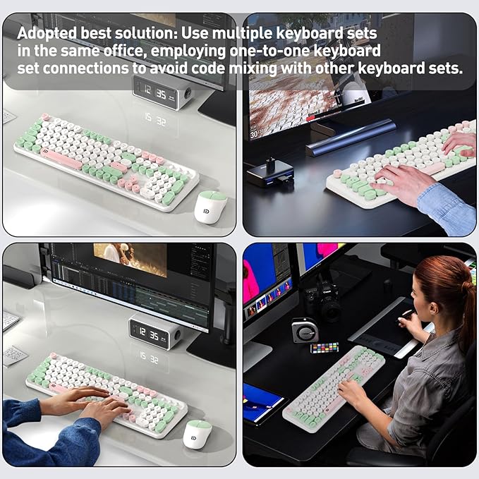 - ⊙ Fashion & Quiet Mouse Design Desk Accessories Keyboard - Stylish retro keyboard and mouse wireless with colorful round 105keys and glossy smooth edges to brighten your workspace. Featuring low-profile whisper-quet technology, this sleek combo ensures a distraction-free typing experience. Perfect for modern desks seeking cute wireless keyboard and mouse aesthetics.