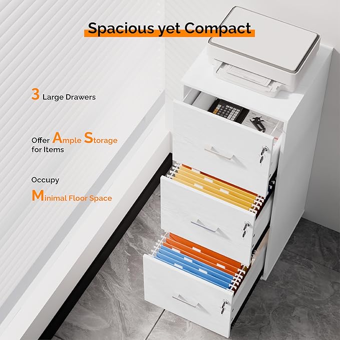 - 【Spacious yet Compact】This tall file cabinet features 3 drawers, offering abundant storage to neatly organize your paperwork and ensuring easy access, all while occupying minimal floor space.