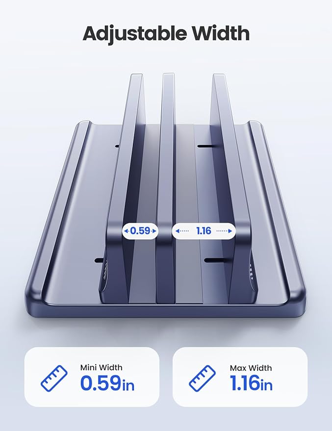 - Adjustable Width:The vertical laptop stand accommodates laptops with thicknesses ranging from 0.55 inches to 1.16 inches , ensuring a snug fit for most devices.Included Allen wrench for free adjustment to the most suitable width,This versatility makes it suitable for various laptop models and brands.