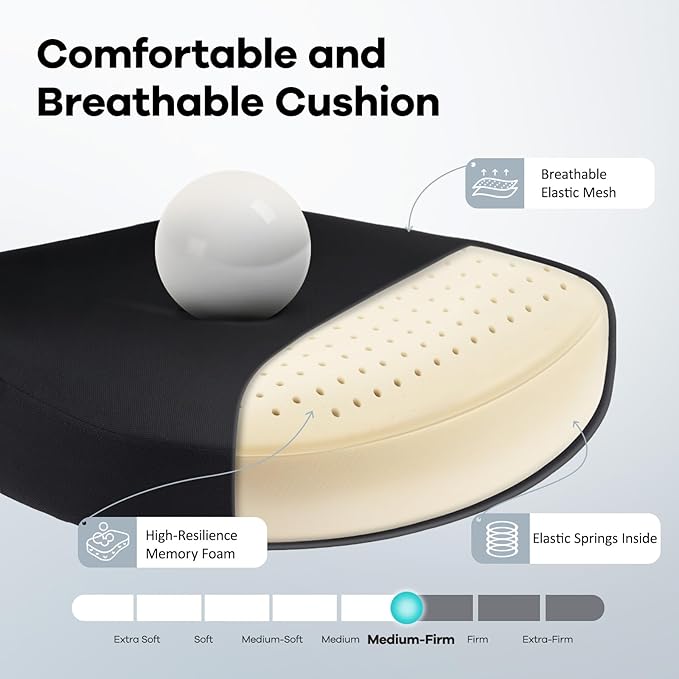 - Comfortable and Breathable Cushion:The U-shaped seat cushion filled with high-density foam and pocket springs conforms to your body and relieves pressure on your thighs and hips,providing ultimate comfort for extended sitting periods.The large 20.8" W x 20.5" D seat cushion accommodates different sitting positions.The breathable mesh fabric enhances air circulation and keeps you cool all day long.