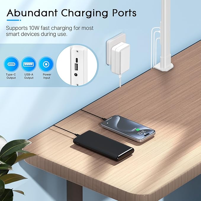 - Support 10W Fast USB & Type-C Charging Output - The clamp on desk lamp is equipped with a USB-A charging port and a Type-C charging interface, allowing you to charge two devices at the same time while enjoying the illumination of the desk lamp for home office.