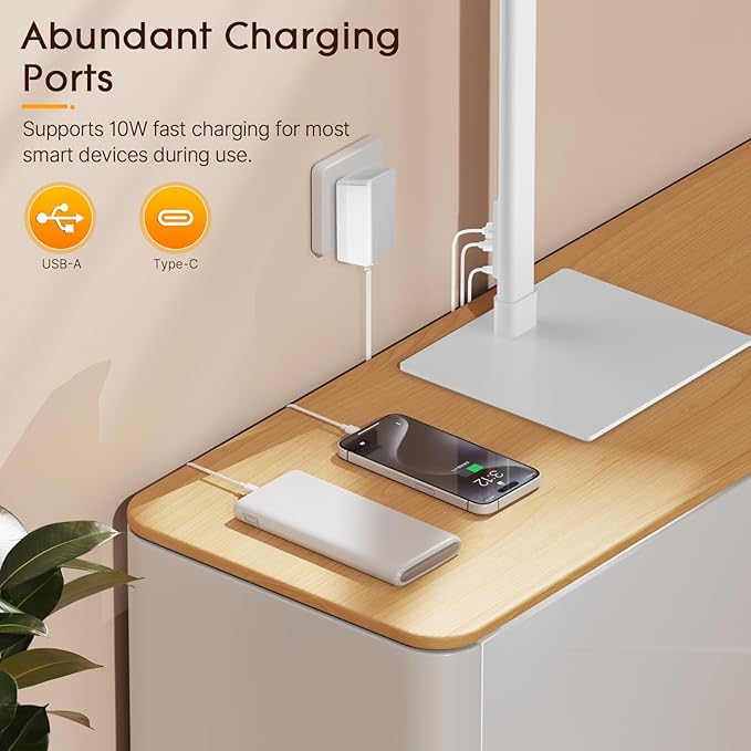 - Dual USB Charging Port & Memory Function - The table light is equipped with a USB charging port and a Type-C charging interface, allowing you to charge two devices at the same time while enjoying the illumination of the desk lamp for home office. Meanwhile the memory function ensures your last settings are restored and eliminates the hassle of reconfiguring the lights after each turn on.