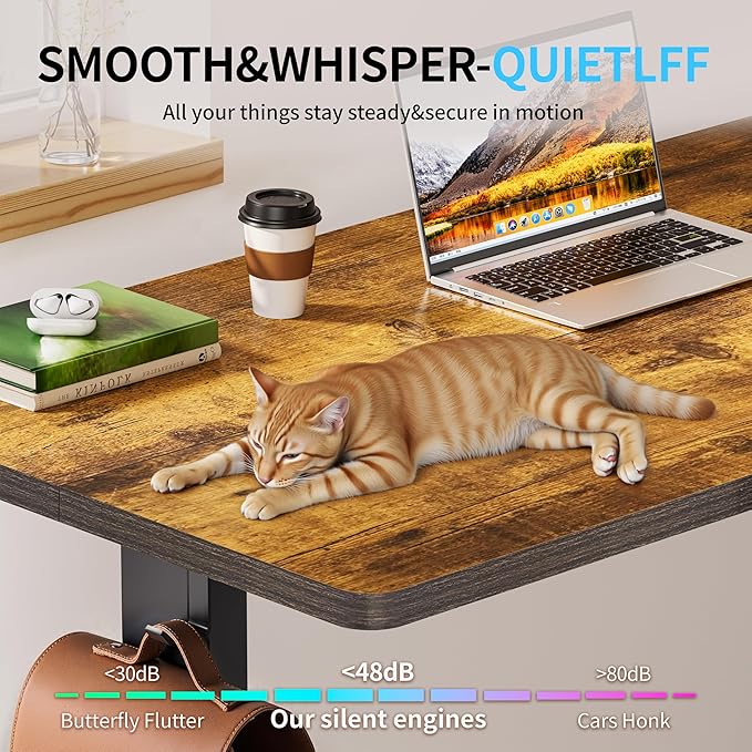 - Ergonomic 55"x24" Desktop: This sit stand desk can accommodate at least two monitors and a laptop. The spacious desktop enhances work efficiency. The 55 inch desk is available in black, and rustic colors. It features a unique wooden pattern, and two headphone hooks, and is FCC and EMC-certified