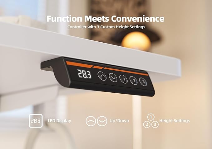 - 3-Button Memory Presets: The electric standing desk features an LED display hand controller for easy height adjustments and to monitor the current height. It also comes with three memory preset buttons, allowing users to quickly switch between their preferred heights with just one touch, enhancing convenience and work efficiency.