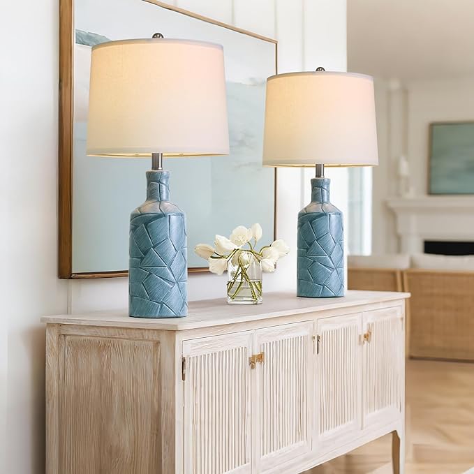 PoKat 26'' Farmhouse Ceramic Table Lamps Set of 2, Blue Bedside Lamps for Living Room, Nightstand Lamps for Bedroom Night Stands, Bedroom Lamps for Side Table End Table Hallway, Blue