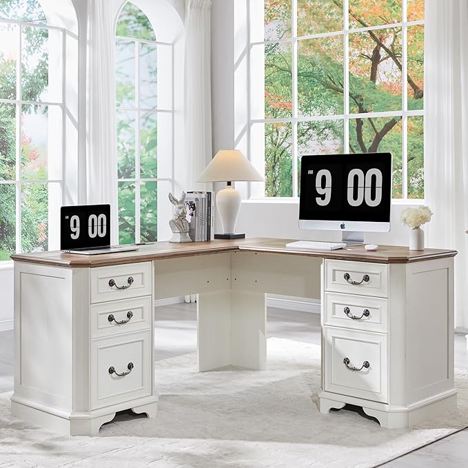 T4TREAM 59" Executive L Shaped Desk with Drawers,Farmhouse Wood Computer Coner Desk, Featuring Charging Station,File Drawer, Storage Cabinet,for Home Office Work and Study (Antique White)