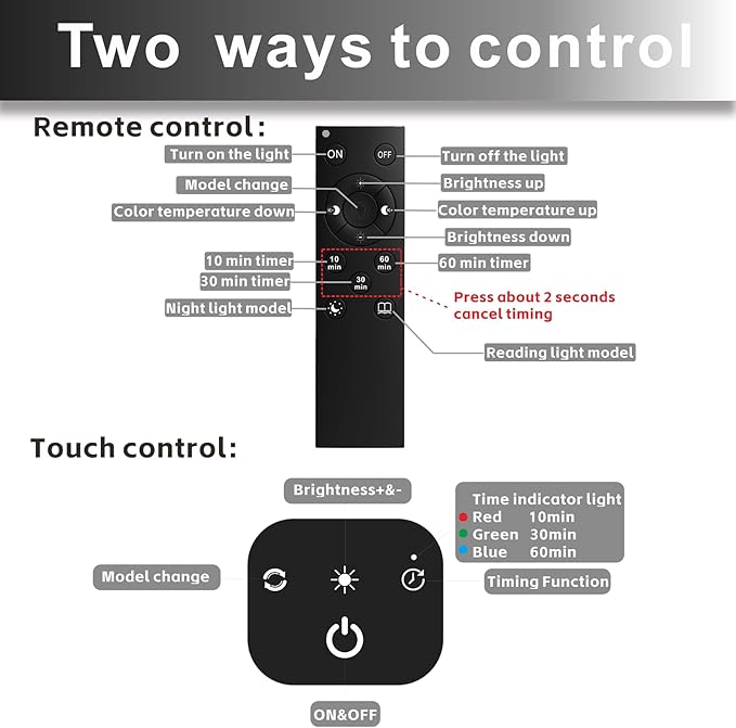 - Timer function: Our office light has 3 timing modes, the touch panel has indicator light (red 10 minutes, green 30 minutes, blue 60 minutes), three timing buttons for the remote control, press and hold one of them for more than 2 seconds to cancel the timer
