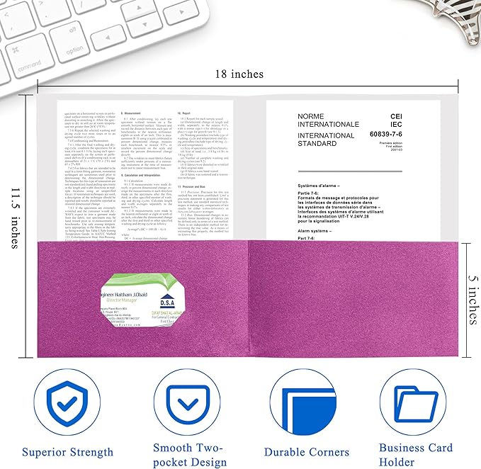 - Professional Design:Two pockets provide storage space for paper,brochures,and more,Each folders for documents measures 9" x 11.5",with two 5" pockets,holds (over 100) sheets of paper,and has a universal business card holder on the right pocket.
