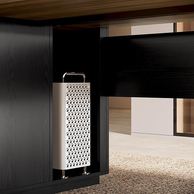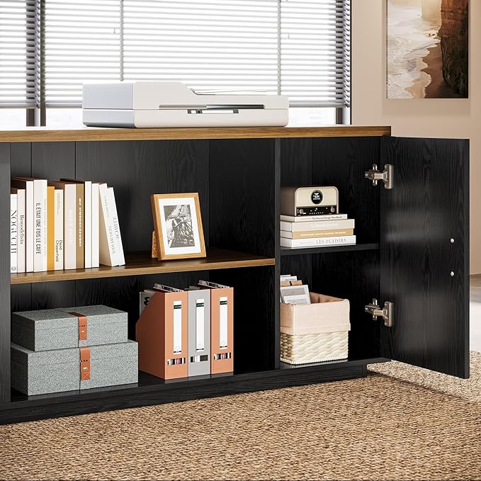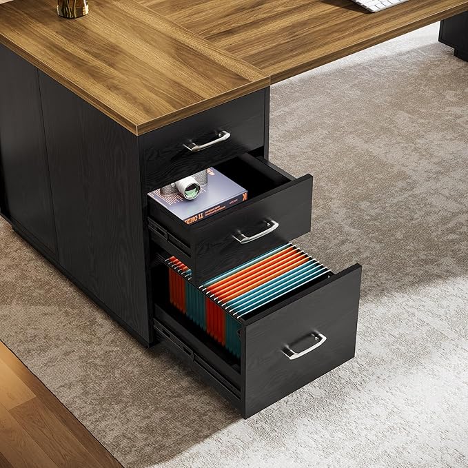 - Powerful Storage Function: This L-shaped executive desk comes with 1 file drawer (equipped with a hanging file system), 2 storage drawers, 1 open storage shelf, 1 in-cabinet storage shelf, and a CPU compartment. The black-brown finish complements its robust storage design, keeping all office essentials organized and easily accessible