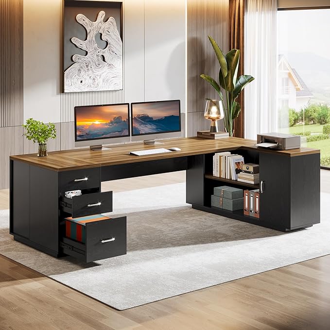 - Large L-Shaped Executive Desk: Measuring 54.7" D x 85.8" W, this Tribesigns black-brown executive desk offers a capacious work surface, ideal for accommodating dual monitors, printers, and various office supplies—perfect for executives aiming to boost work efficiency