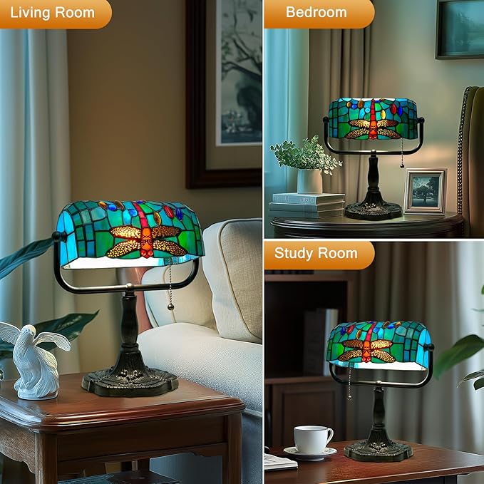 - Bank Lamp with Pull Chain Switch - The banker lamp features an easy-to-use pull-chain switch for effortless operation, maintaining its classic bankers lamp authenticity. With compact dimensions (10.5"L x 4.5"W x 12"H), Shade Dimensions: 9"Lx 4.5"Wx 4"H, this Tiffany-style table lamp fits any space. Ideal as a desk lamp, decorative accent, or gift-ready centerpiece