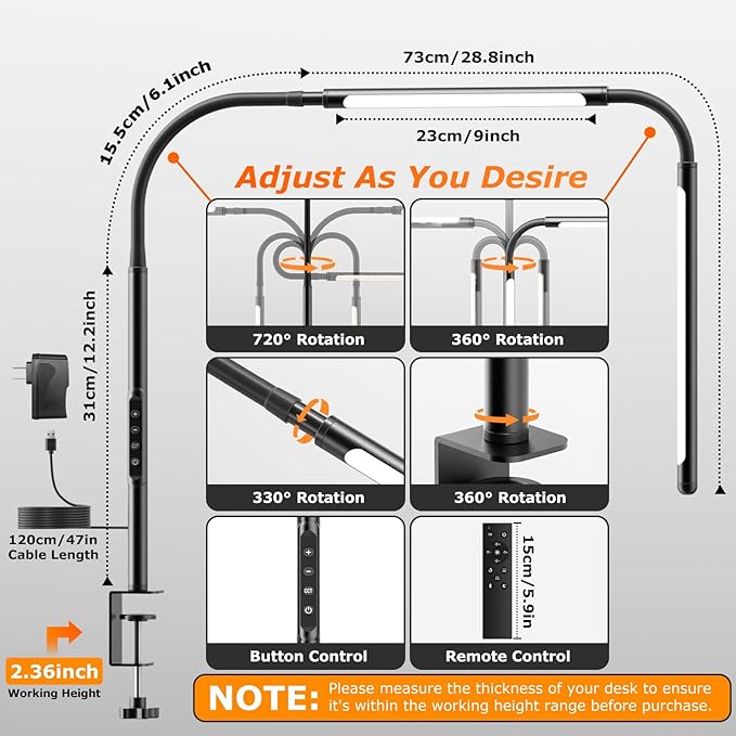 - 720° Adjustable Flexible Gooseneck: Our desk light features two flexible goosenecks (360° & 720°) and a 330° rotatable light tube, allowing precise light direction to reduce eye strain and improve comfort. Made of aluminum and ABS, it offers excellent heat dissipation and a long lifespan of up to 10,000 hours. Built-in cable management keeps your workspace neat and organized