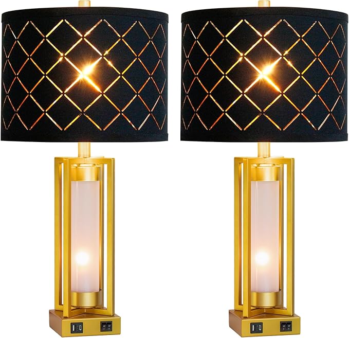 RORIANO Set of 2 Modern Table Lamps for Living Room Bedroom with USB C+A, Rustic Nightstand Lamps with White Night Light, Black Grid Shade, Desk Lamps for Bedside End Tables, 4 Bulbs Included (Gold)