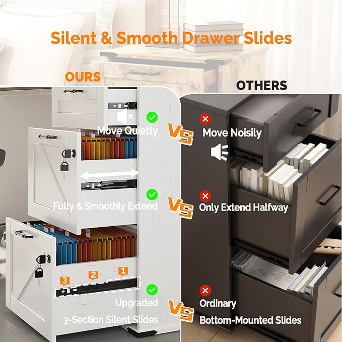 - 【Silent Sliding Perfection】The three-section slides ensure the drawers extend fully and smoothly, without a hint of noise, making it convenient for you to search for and access your file folders.