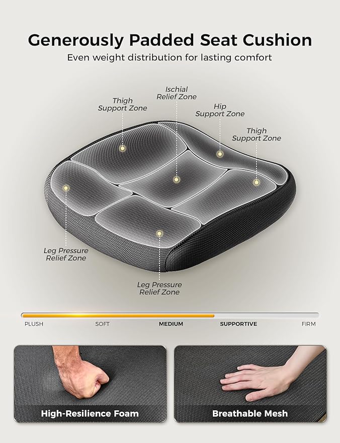 - Comfort with All-Day Support: 3" dual-density foam seat with pressure-relieving design makes this mesh chair ideal for office use. Breathable mesh keeps you cool at your desk while the cushion supports proper posture. Heavy-duty base provides stable support for 8+ hours of continuous use