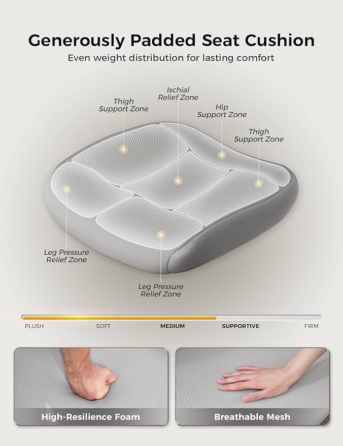 - Comfort with All-Day Support: 3" dual-density foam seat with pressure-relieving design makes this mesh chair ideal for office use. Breathable mesh keeps you cool at your desk while the cushion supports proper posture. Heavy-duty base provides stable support for 8+ hours of continuous use