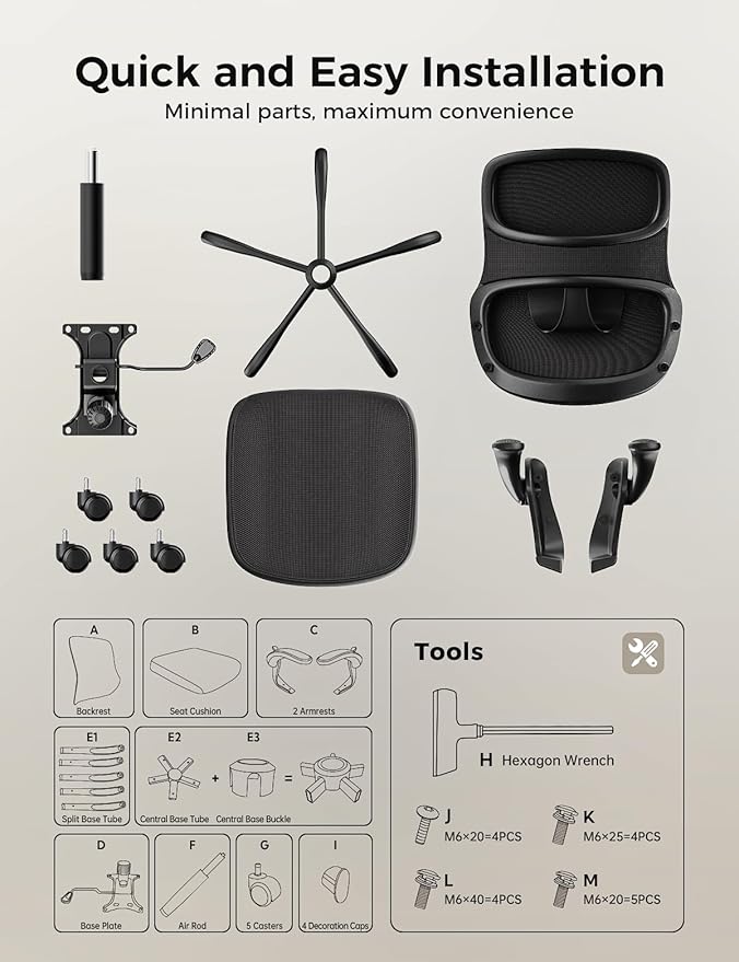 - Quick Install: This mesh office chair comes with all tools and hardware needed for desk setup. The clear instructions use numbered steps for straightforward assembly. Even one person can complete the installation within 15 minutes