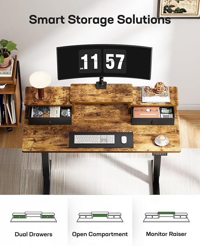 Marsail Electric Standing Desk with Drawers, 55″ x 28″ Height Adjustable Sit Stand Up Desk with Storage Shelf, Ergonomic Home Office & Computer Table with 4 Memory Heights, Rustic Brown